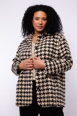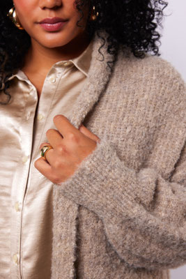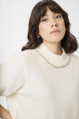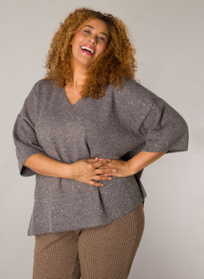 Sac fourrure porté épaule, noir ou léopard 39€, veste sequins argent à 79€, du 40 au 50, Pull ivoire avec collier cousu à 59€, top sequin kaki ou ivoire à 59€, du 42 au 52, jupe et top strass à 59€ et 49€, du 42 au 50.